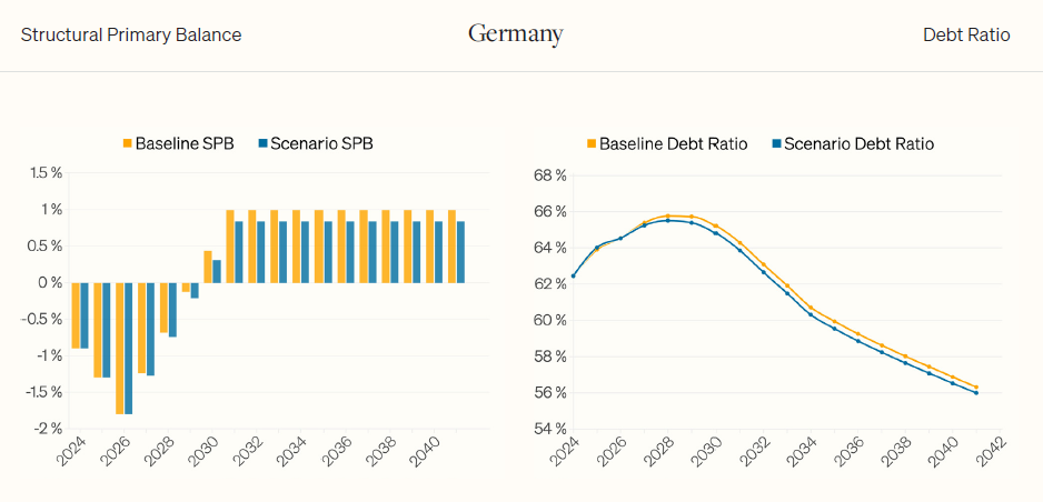 L’exemple allemand illustre l’ampleur de ce changement d’approche. Dans le scénario de référence utilisé dans les plans budgétaires à moyen terme (MTFSP), la croissance potentielle est estimée à 0,90 % par an, ce qui implique un objectif de solde primaire structurel (SPB) d’environ 0,99 % du PIB pour stabiliser la dette. Mais lorsque les auteurs intègrent les effets macroéconomiques de long-terme du programme d’investissement dans les infrastructures publiques du gouvernement Merz de 500 Mds€, la croissance potentielle s’élève à 1,15 %, permettant de ramener la cible de solde structurel primaire requis à 0,84 % du PIB.