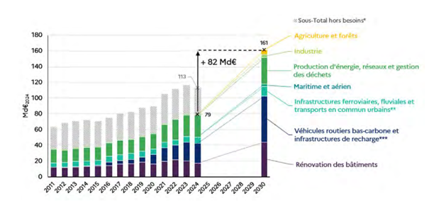 Lecture : En 2011, les investissements bas-carbone atteignaient 63 Md€ en France. En 2024, ils ont atteint 113 Md€.